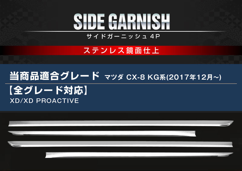 ※2018年11月マイナーチェンジ前後対応 商品 サイドガーニッシュ 4P 素材 ステンレス(SUS304) カラー ステンレス鏡面仕上げ 仕様 マツダCX-8のサイドドアの樹脂部分に装着するパーツです。